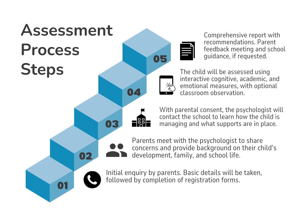 We provide comprehensive evaluations covering intellectual functioning, academic attainment, attention and focus, emotional wellbeing, behavioural challenges, and social-communication skills. These assessments help children, parents, and teachers understand how a child thinks, why they might behave in certain ways, what excites them, and what may be difficult or overwhelming. Just as importantly, assessments highlight a child’s strengths, helping families and schools respond with greater acceptance and compassion, while building on areas of potential.